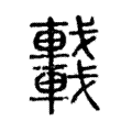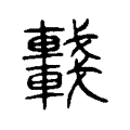 以複體表現,本是籀文的特色,車上插了「戈」,應屬兵車。至於它的構形,應是「从二車、二戈,車亦聲」。在六書中屬於形聲。